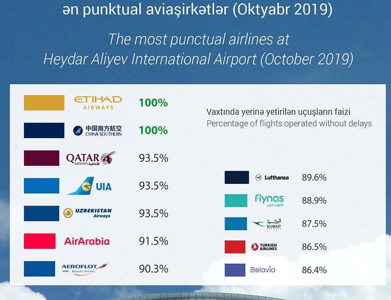 Heydər Əliyev Beynəlxalq Aeroportunun mətbuat xidmətindən “Marja”ya daxil olmuş məlumatda bildirilib ki, 2019-cu ilin oktyabr ayında Heydər Əliyev Beynəlxalq Aeroportundan yola düşən aviaşirkətlər arasında ən yüksək nəticəni – 100% punktuallıq ilə BƏƏ-nin milli aviadaşıyıcısı “Etihad Airways” və Çinin “China Southern” aviaşirkəti göstərmişdirlər.