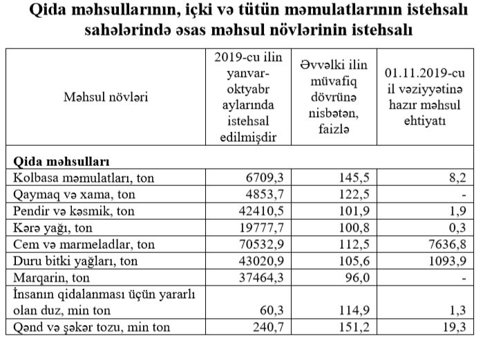 Bu sahələrin əsas məhsullarından qənd və şəkər tozu istehsalı 51,2 faiz, kolbasa məmulatları 45,5 faiz, qaymaq və xama istehsalı 22,5 faiz, cem və marmeladların istehsalı 12,5 faiz, alkoqolsuz içkilərin istehsalı 11,2 faiz artmışdır.