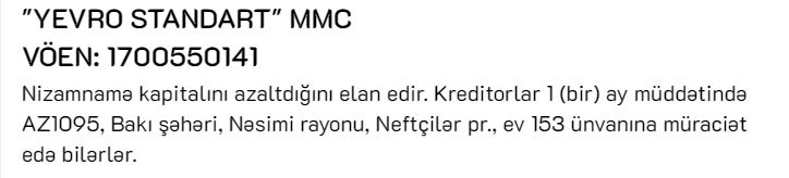 Azərbaycanda 3 iri maliyyə təşkilatının səhmdarı olan "Yevro Standart" MMC şirkəti nizamnamə kapitalını azaltdığını elan edir. "Marja" şirkətin elanına istinadən xəbər verir ki, kreditorlar 1 müddətində AZ1095, Bakı şəhəri, Nəsimi rayonu, Neftçilər pr., ev 153 ünvanına müraciət edə bilərlər.