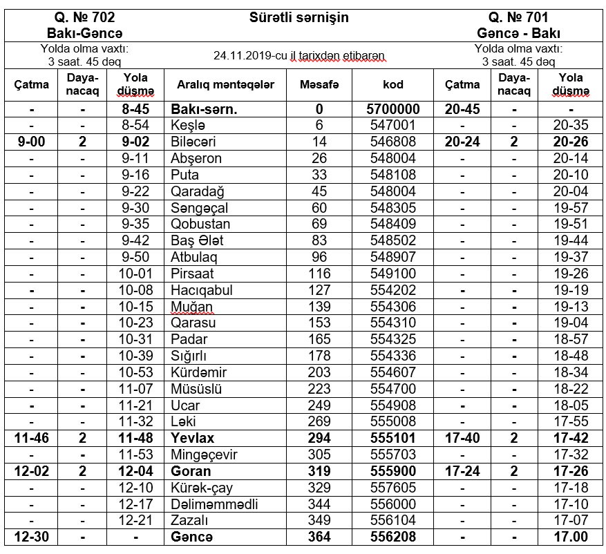 Qatarların Bakıdan və Gəncədən yola düşmə vaxtı isə olduğu kimi saxlanılacaq. Yeni qrafikdə qatarın yolda olma müddəti 4 saat 15 dəqiqədən 3 saat 45 dəqiqəyə enəcək. Bununla da, sərnişinlər mənzil başına 30 dəqiqə tez çatdırılacaq.
