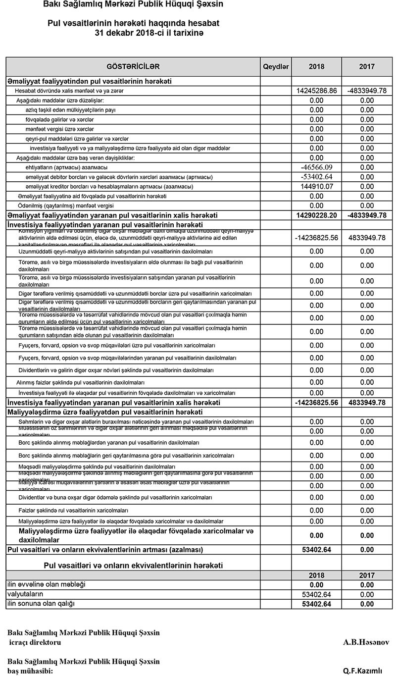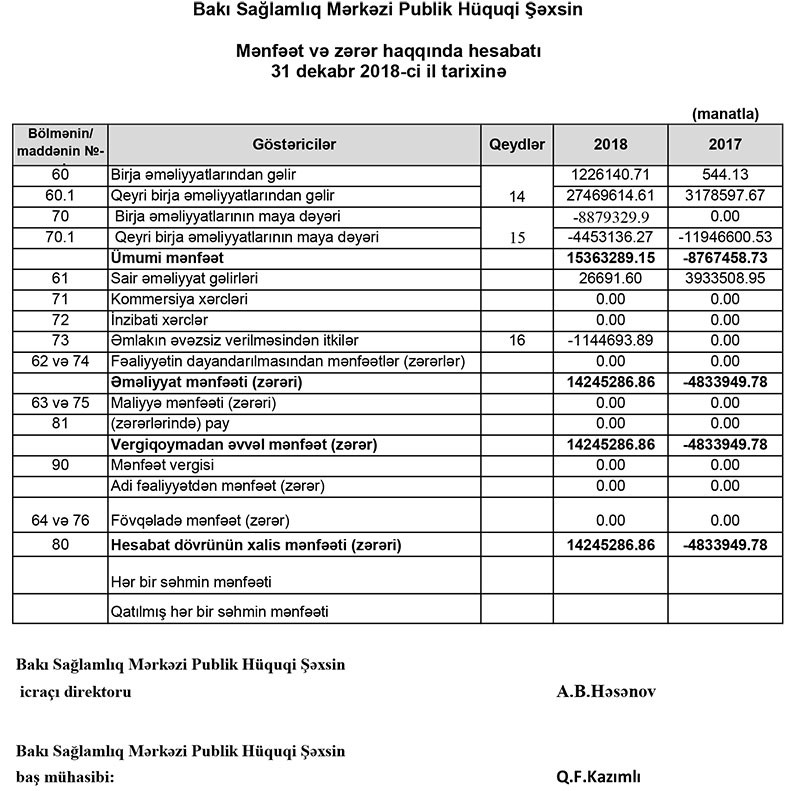 Bakı Sağlamlıq Mərkəzi Publik Hüquqi Şəxsi 2018-ci ili 14 milyon 245 min manat xalis mənfəət ilə başa vurub. Halbuki, Mərkəz 2017-ci ili 4 milyon 834 min manat zərər ilə bağlamışdı. Qeyd edək ki, Bakı Sağlamlıq Mərkəzi 2018-ci ilin əvvəlindən pablik hüquqi şəxsdir.