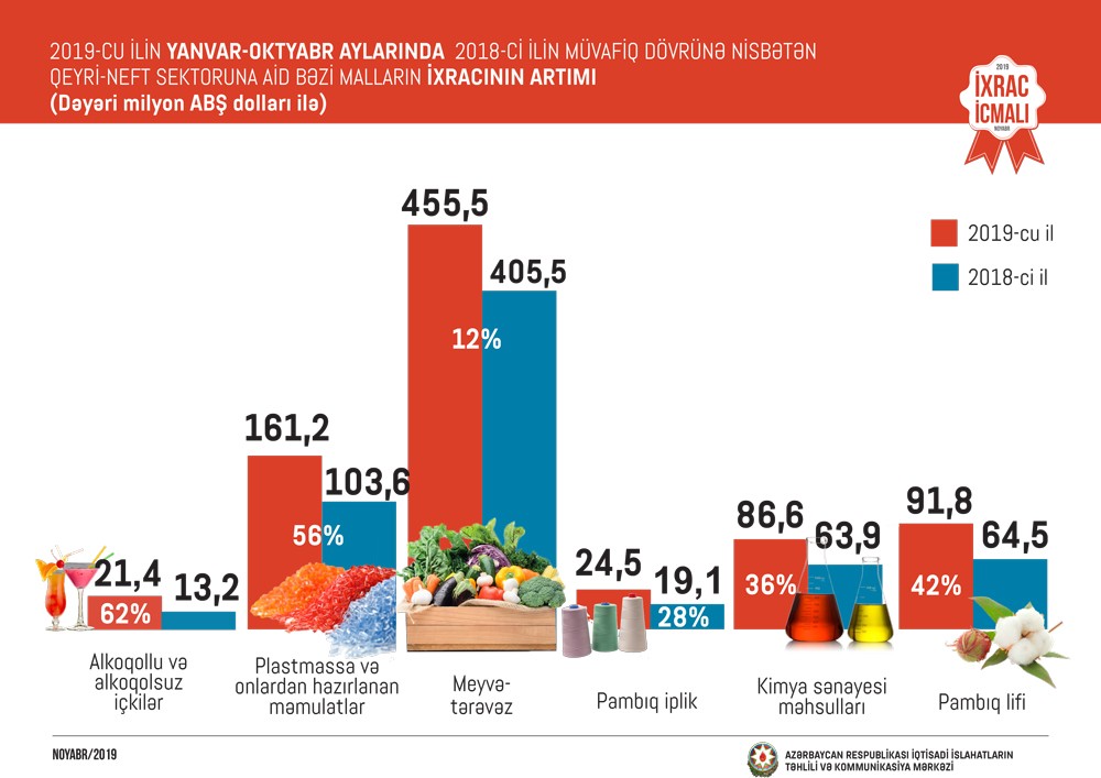 2018-ci ilin müvafiq dövrü ilə müqayisədə cari ilin yanvar-oktyabr aylarında alkoqollu və alkoqolsuz içkilərin ixracı 62 faiz, plastmassa və onlardan hazırlanan məmulatların ixracı 56 faiz, pambıq lifinin ixracı 42 faiz, kimya sənayesi məhsullarının ixracı 36 faiz, pambıq ipliyinin ixracı 28 faiz, meyvə-tərəvəzin ixracı 12 faiz, şəkər ixracı 10 faiz, elektrik enerjisi – 6 faiz artıb.