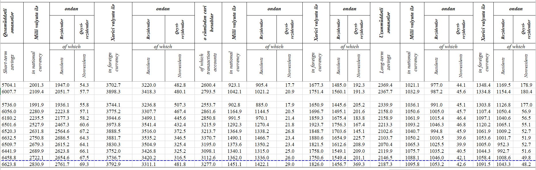 2019-cu ilin Oktyabr ayının sonundakı 8 milyard 811,1 milyon manat cəmi əmanətlərin 6 milyard 623.8 milyon manatını və ya 75,2%-ni qısamüddətli (1 ilədək), 2 milyard 187.3 milyon manatını və ya 24,8%-ni uzunmüddətli əmanətlər təşkil edib.