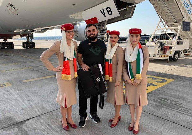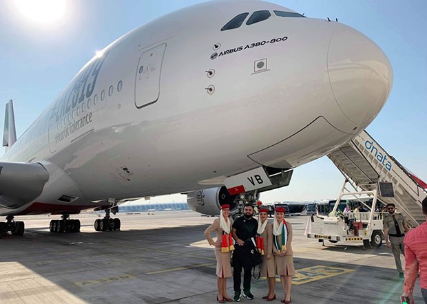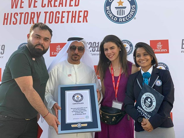 Rəsmi rekord cəhdi üçün “Emirates” hava yollarına məxsus A380 təyyarəsi (təyyarə bu hadisəyə özəl olaraq rənglənib: üzərində müxtəlif millətlərdən əl-ələ tutmuş insanlar təsvir edilib). Tarixi EK2019 səfər sayısı olan reys Dubay Beynəlxalq Hava Limanından (DXB) qalxaraq, BƏƏ-nin bütün əmirlikləri üzərində uçuş edəndən 1 saat sonra yenidən Dubaya qayıdıb.