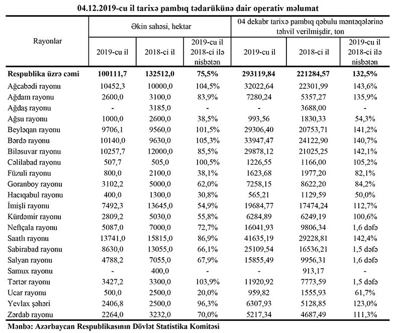 Rspublikada pambıq tədarükünə dair dekabrın 4-nə olan operativ məlumatı təqdim edirik.