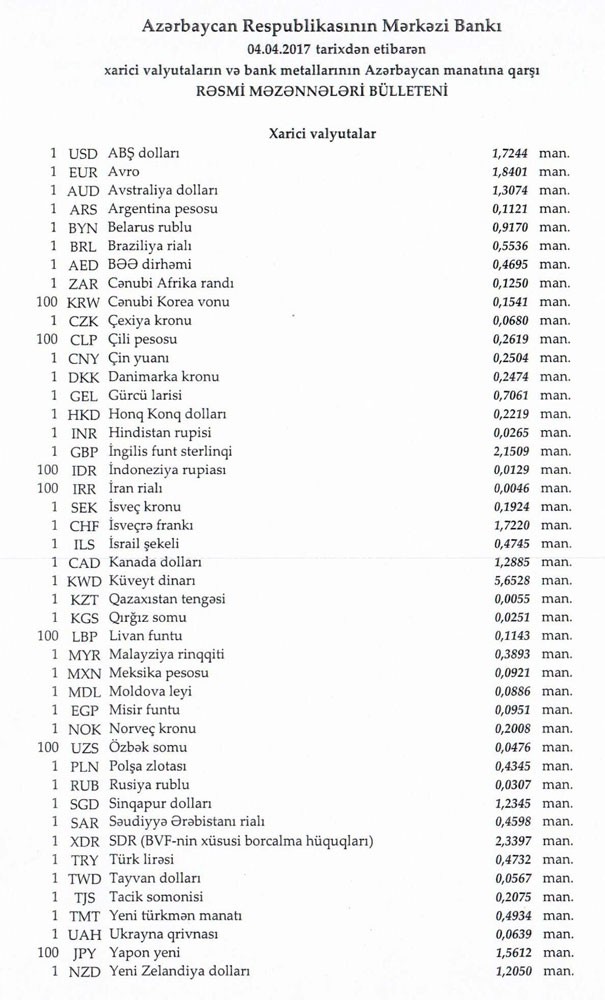 Aprelin 3-də 1 dollar 1,7244 manata, 1 avro isə 1.8417 manata bərabər idi.