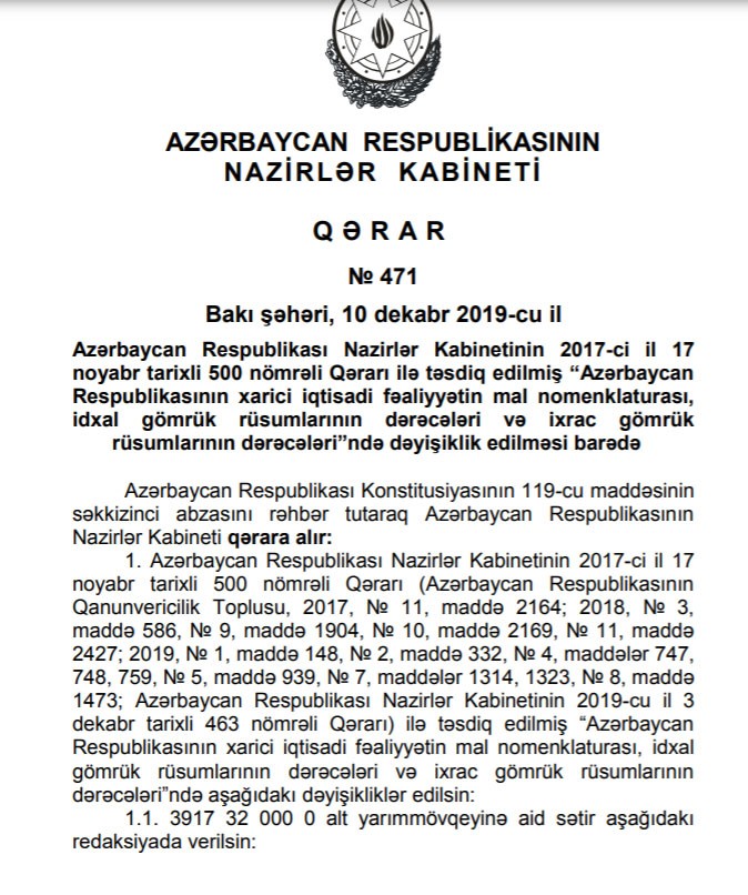 "Marja" xəbər verir ki, Nazirlər Kabineti bununla bağlı “Azərbaycan Respublikasının xarici iqtisadi fəaliyyətin mal nomenklaturası, idxal gömrük rüsumlarının dərəcələri və ixrac gömrük rüsumlarının dərəcələri”ndə dəyişiklik edib.