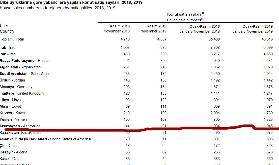 Azərbaycanlılar Türkiyədə mənzil alan xaricilər arasında 13-cü yerdədir. Yanvar - Noyabr dövründə Türkiyədən ən çox mənzili İraq vətəndaşları alıblar - 6699 mənzil. İraqlıların ardınca 4660 mənzil ilə İran, 22531 mənzil ilə Rusiya vətəndaşları gəlirlər.