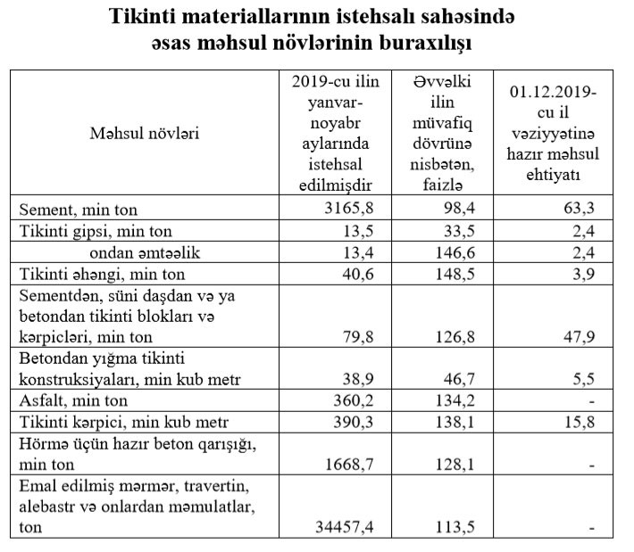 Ümumiyyətlə, 2019-cu ilin yanvar-noyabr aylarında tikinti materiallarının istehsalı sahəsində fəaliyyət göstərən müəssisələr tərəfindən istehsal edilmiş məhsulun ümumi dəyəri 4,4 faiz artaraq 709,8 milyon manat təşkil edib. Tikinti kərpicinin istehsalı 38,1 faiz, tikinti əhənginin istehsalı 48,7 faiz, hörmə üçün hazır beton qarışığının istehsalı 28,1 faiz artıb.