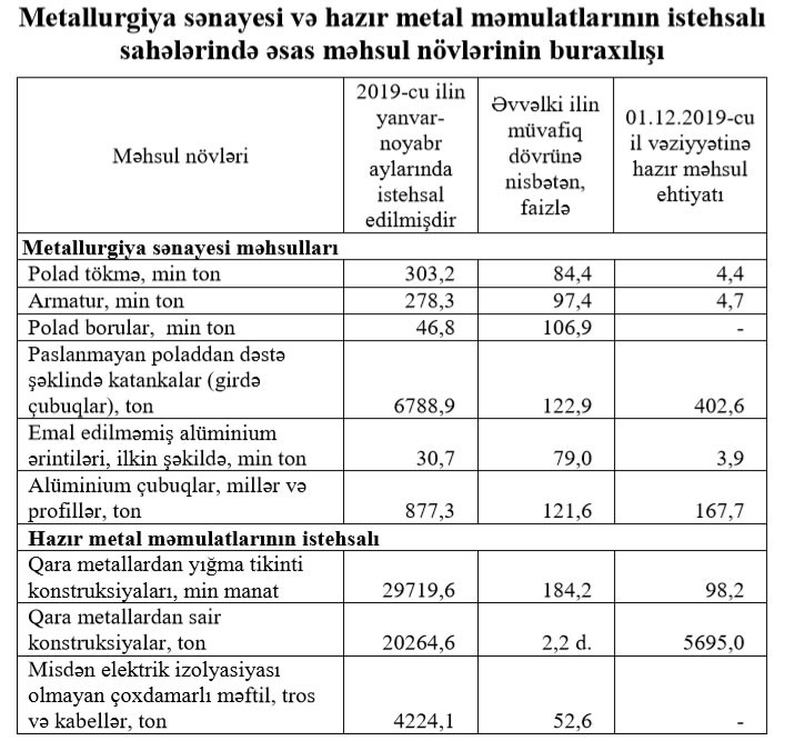 2019-cu ilin yanvarnoyabr aylarında 278,3 min ton armatur istehsal edilib, bu, əvvəlki ilin müvafiq dövrünə nisbətən 2,6% azdır.