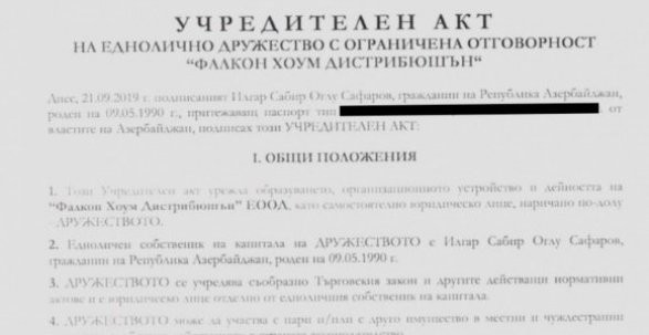 2018-ci ildə Sofiyada qeydiyyatdan keçən “Falcon Home Distribution” barədə, şirkətin mebel, parça, ayaqqabı və s. malların satışı ilə məşğul olduğu məlumdur. Onun əvvəlki sahibi 50 yaşlı Azərbaycan vətəndaşı Zaur Mişiyev olub. 2019-cu ilin sentyabrından onun yeganə sahibi Azərbaycan vətəndaşı İlqar Səfərovdur.