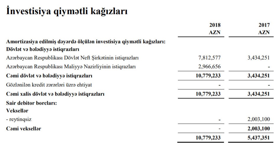 2017-ci ilin sonunda 3 milyon 434 min 251 manatlıq SOCAR istiqrazlarına malik olan İSB, 2018-ci ildə bu qiymətli kağızlara investisiyalarını 2 dəfədən çox artıraraq 7 milyon 812 min 577 manata qaldırıb.