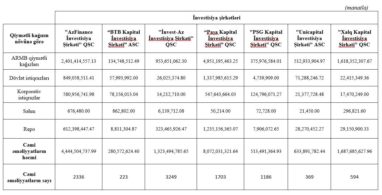 Digər daha yüksək əməliyyat həcminə nail olmuş şirkətlər "AzFinance İnvestisiya Şirkəti" QSC, "Xalq Kapital İnvestisiya Şirkəti" QSC və "İnvest-Az İnvestisiya Şirkəti" QSC-dir.