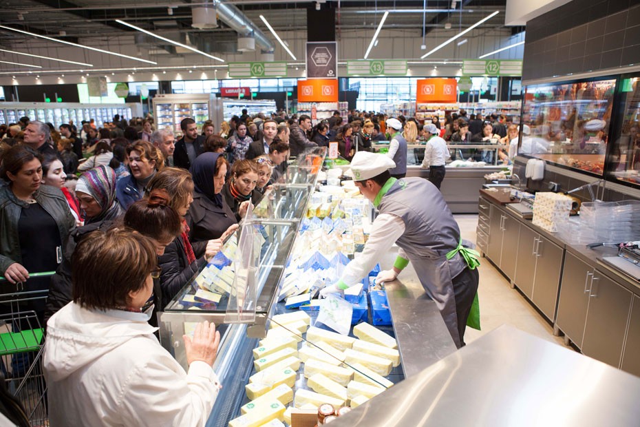 -Daha böyük ət, dəniz məhsulları, qastronomiya, un və qənnadı məhsulları bölmələri