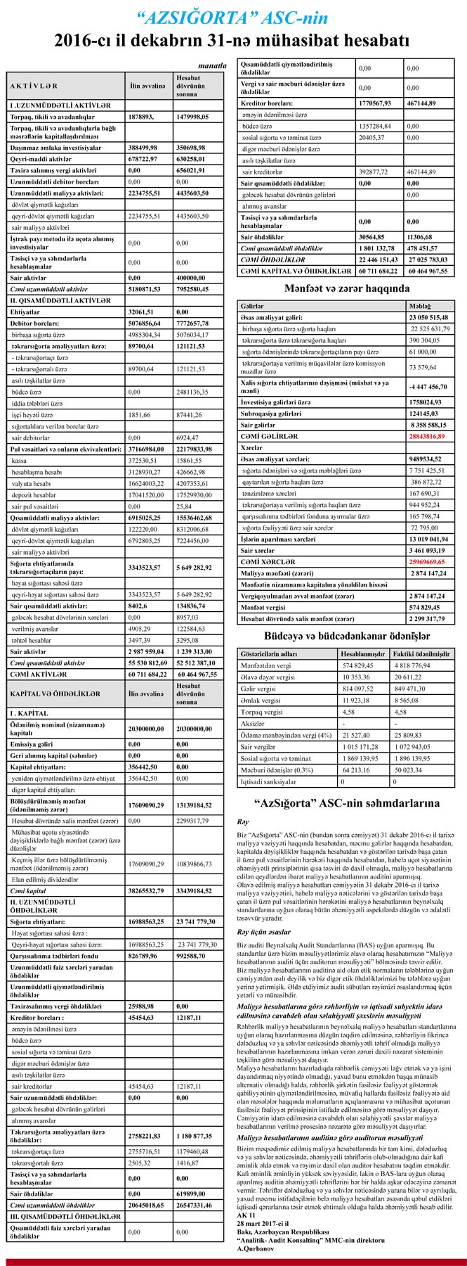 31 Dekabr 2016-cı il tarixinə “AzSığorta” 60 milyon 465 min manat cəmi aktivlərə, 33 milyon 439 min manat cəmi kapitala 27 milyon 26 min manat cəmi öhdəliklərə malik olub.