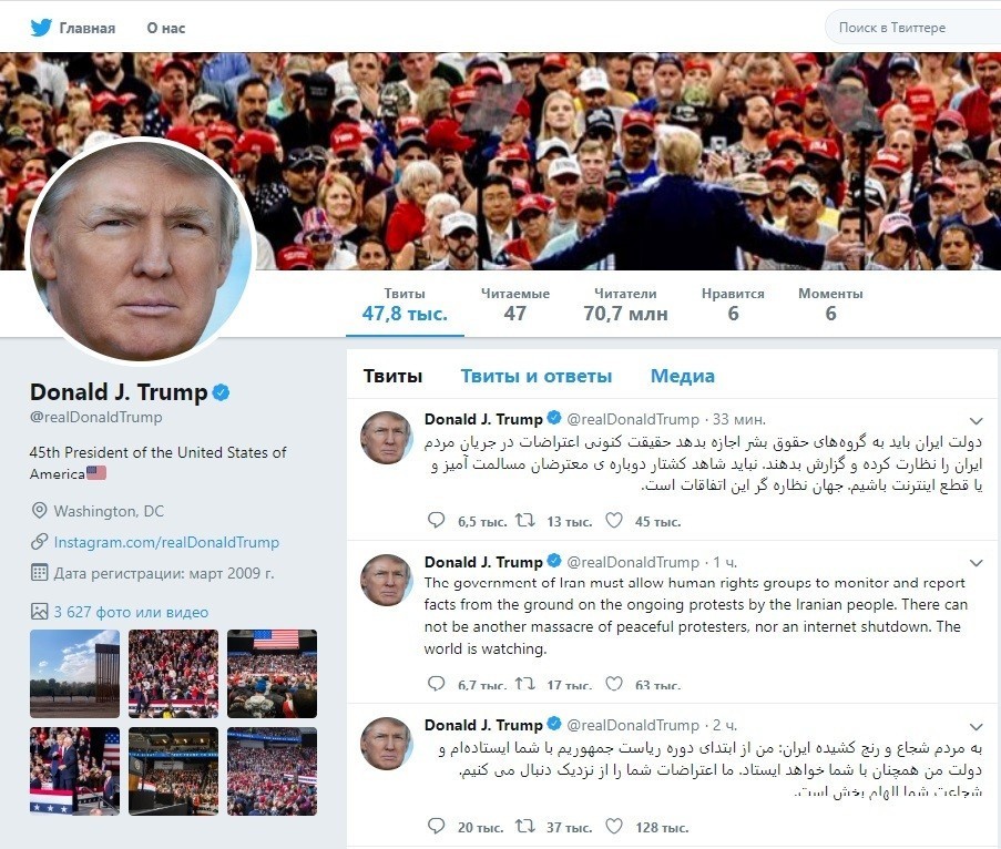 ABŞ prezidenti Donald Tramp “Twitter” mikrobloqunda İrandakı etirazçılara fars dilində dəstək verib.