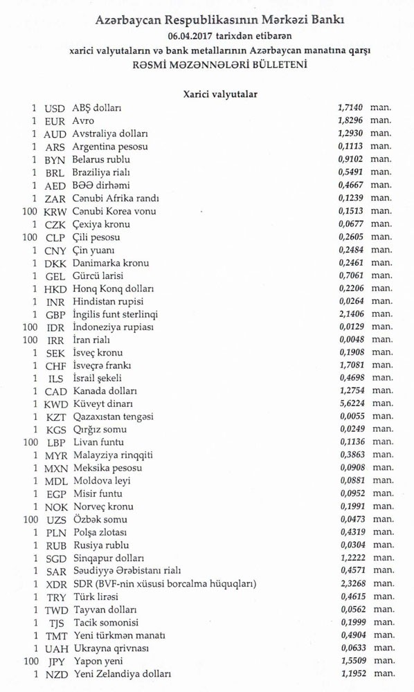 Aprelin 5-də 1 dollar 1,7140 manata, 1 avro isə 1.8295 manata bərabər idi.