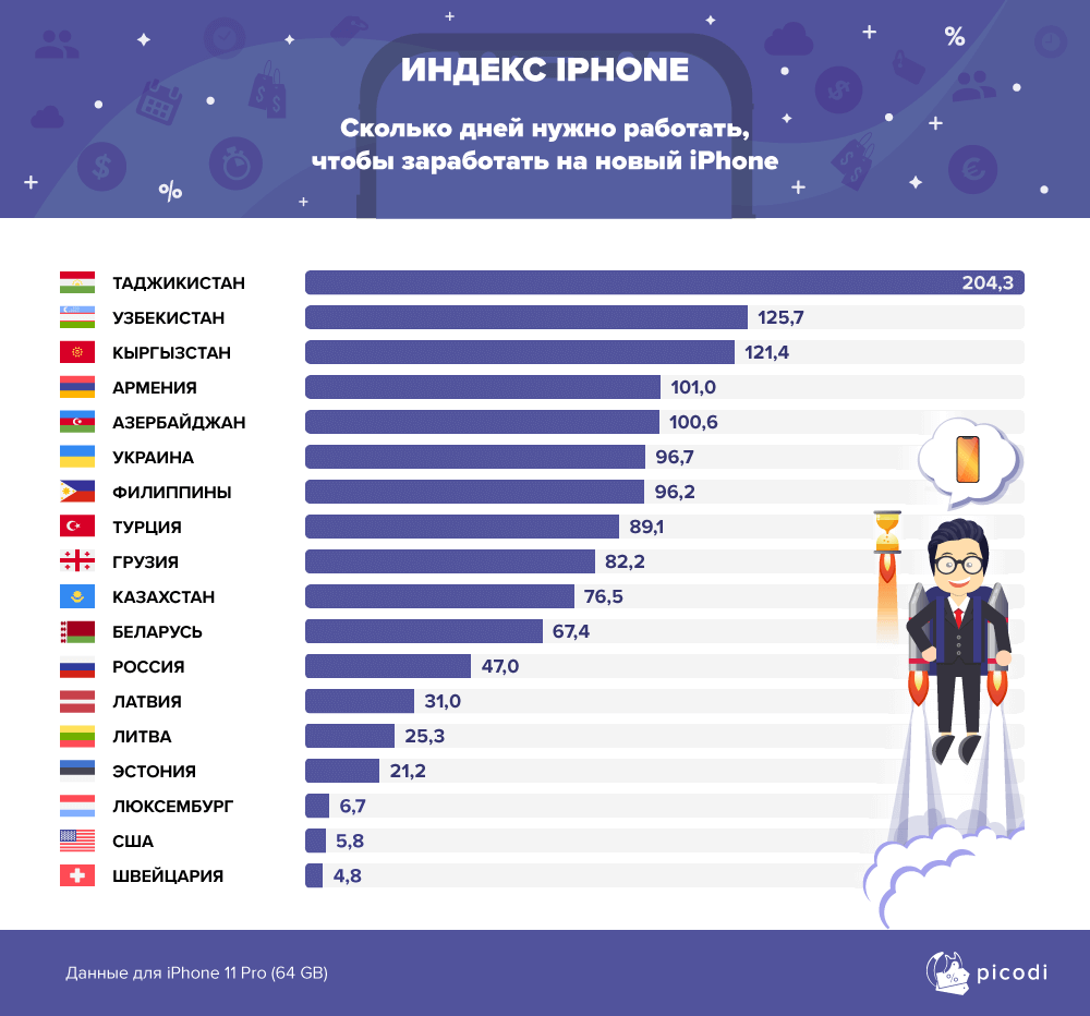 В лидерах рейтинга оказались Швейцария, США, а также Люксембург, где соотношение iPhone’a к средней заработной плате является самым выгодным. Среднестатистический швейцарец сможет накопить необходимую сумму на iPhone 11 Pro за 4,8 дня, американец – за 5,8 дня, a люксембуржец – за 6,7 дня.