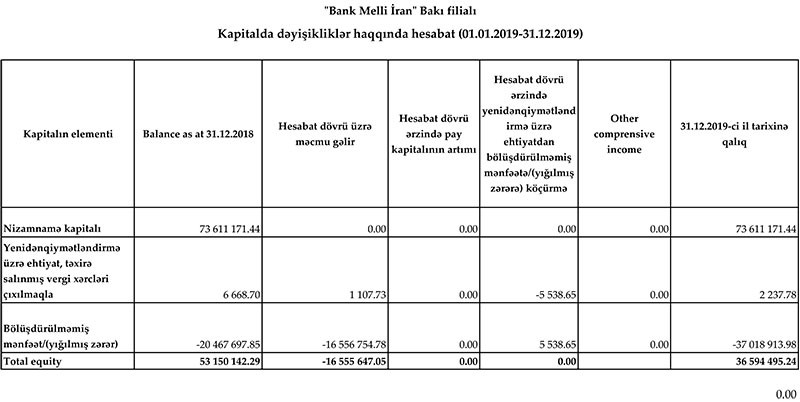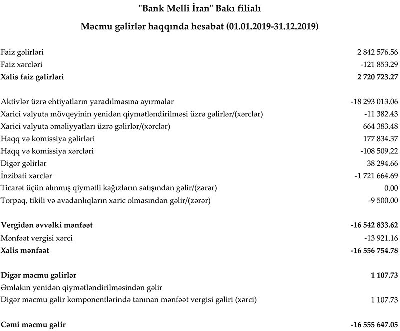 "Bank Melli İran" Bakı filialı 2019-cu ili 16 milyon 556 min manat zərər ilə başa vurub. Müqayisə üçün qeyd edək ki, filial 2018-ci ili 2 milyon 141 min 532 manat xalis mənfəət ilə bağlamışdı.