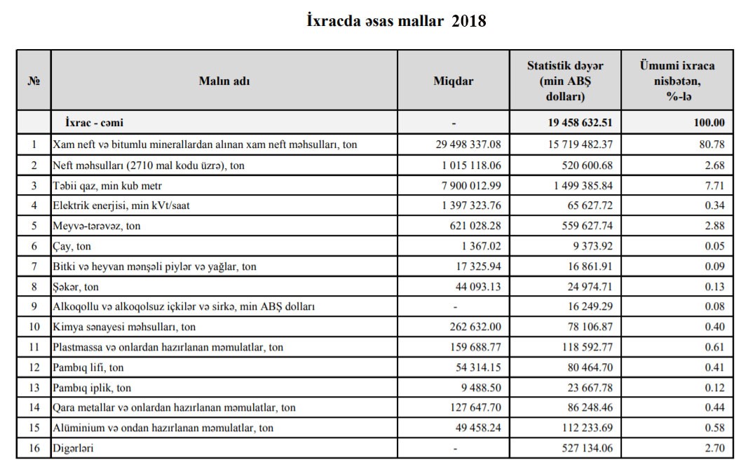 Müqayisə üçün qeyd edək ki, 2018-ci ildə Azərbaycanda 15 milyard 719 milyon 482 min dollar dəyərində 29 milyon 498 min 337 ton xam neft və bitumlu minerallardan alınan xam neft məhsullar ixrac edilmişdi.