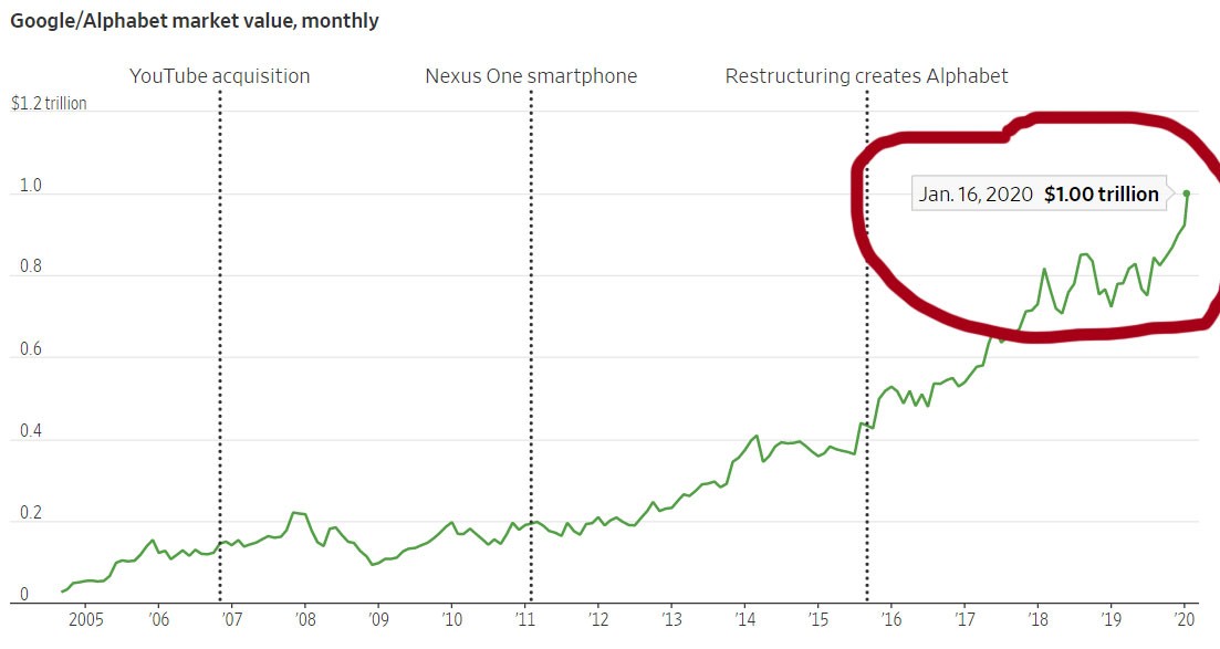 "Google"ın ana şirkəti olan "Alphabet"in də bazar dəyəri 1 trilyon dollara çatıb.