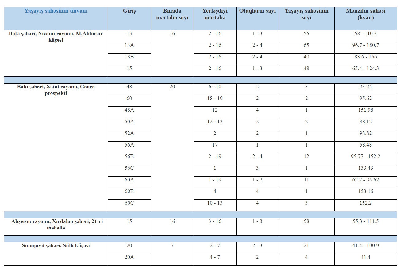 Kirayəyə veriləcək MƏNZİLLƏRİN SİYAHISI AÇIQLANDI