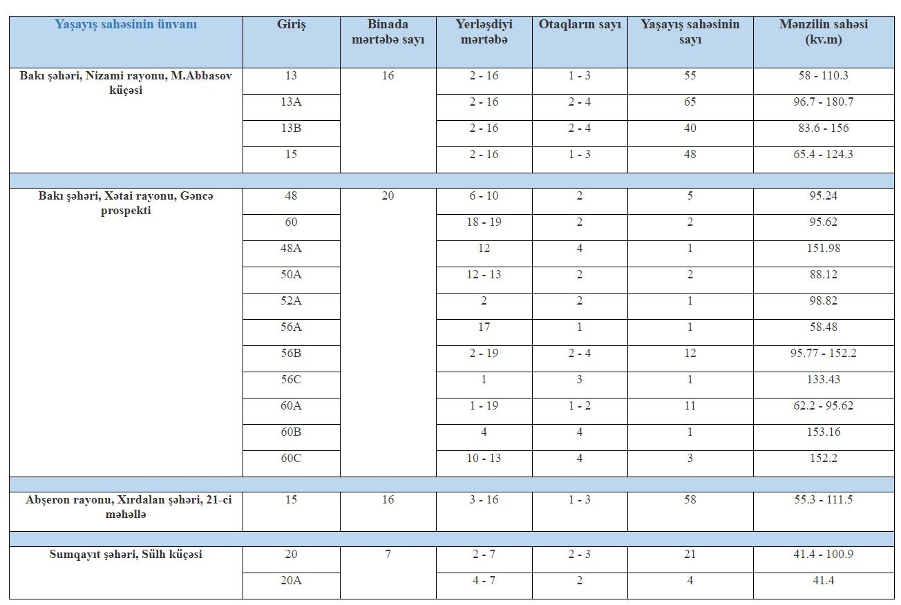 İlkin mərhələdə satmaq öhdəliyi ilə kirayəyə verilməsi nəzərdə tutulan yaşayış sahələrinin yerləşdiyi ərazi, sayı, sahəsi və digər məlumatlar açıqlanıb. Bu məqsədlə İpoteka və Kredit Zəmanət Fondu tərəfindən 331 mənzil alınıb.