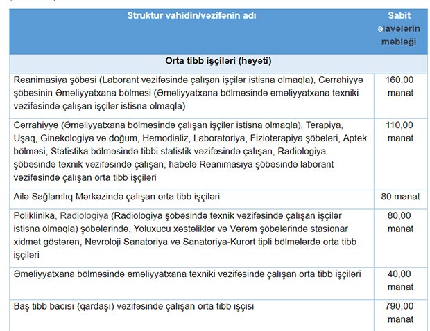 Əlavə olaraq, kənd və qəsəbələrdə yaşayış yerindən uzaq məsafədə çalışan orta və kiçik tibb işçilərinə sabit əlavələr də ödənilir.