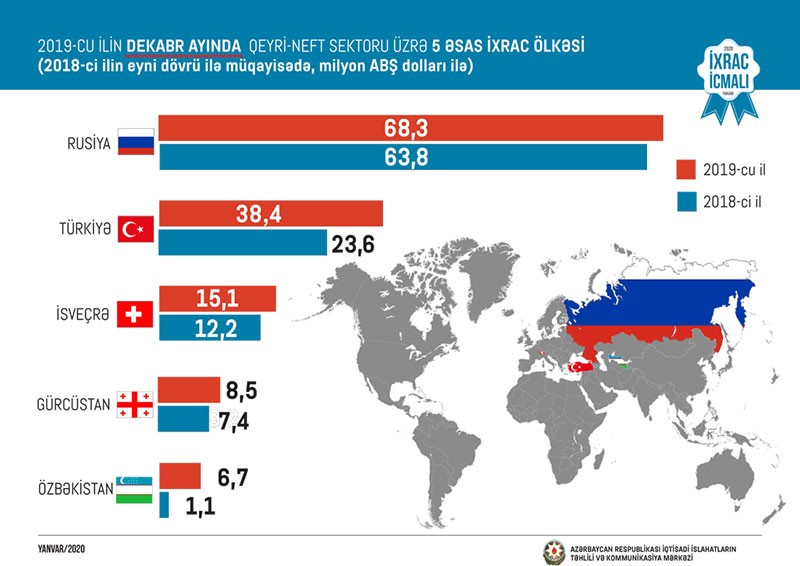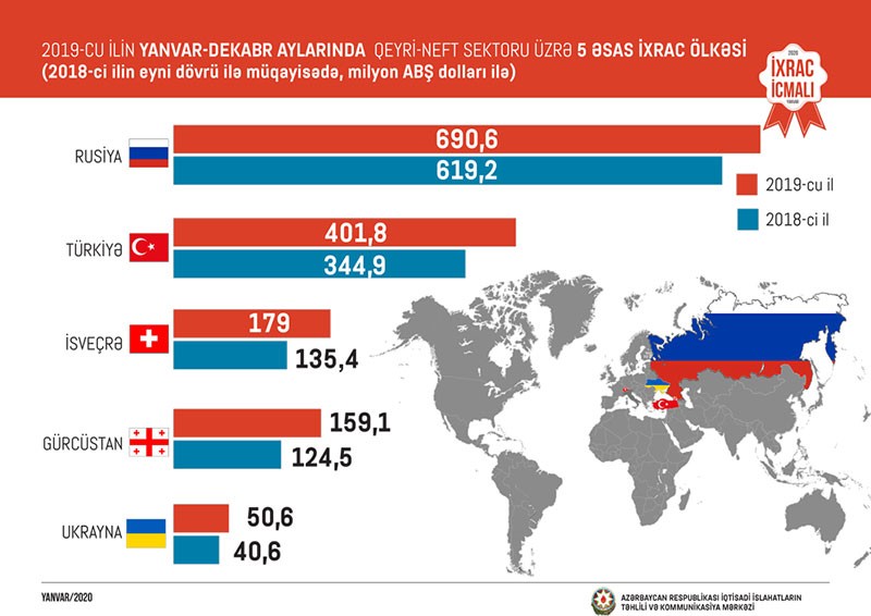 Ötən il ərzində Rusiyaya 690,6 milyon, Türkiyəyə 401,8 milyon, İsveçrəyə 179 milyon, Gürcüstana 159,1 milyon və Ukraynaya 50,6 milyon ABŞ dolları dəyərində qeyri-neft sektoruna aid mal ixrac olunub. 2018-ci ilin müvafiq dövrü ilə müqayisədə 2019-cu ildə Rusiyaya qeyri-neft ixracı 11,5 faiz, Türkiyəyə 16,5 faiz, İsveçrəyə 32,2 faiz, Gürcüstana 27,8 faiz və Ukraynaya 24,6 faiz artıb.