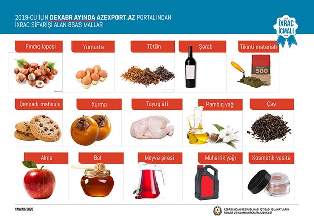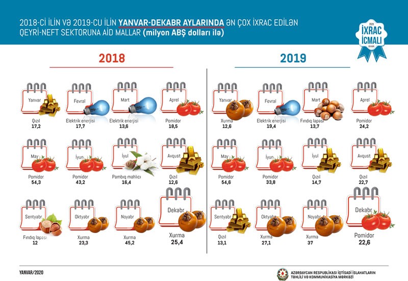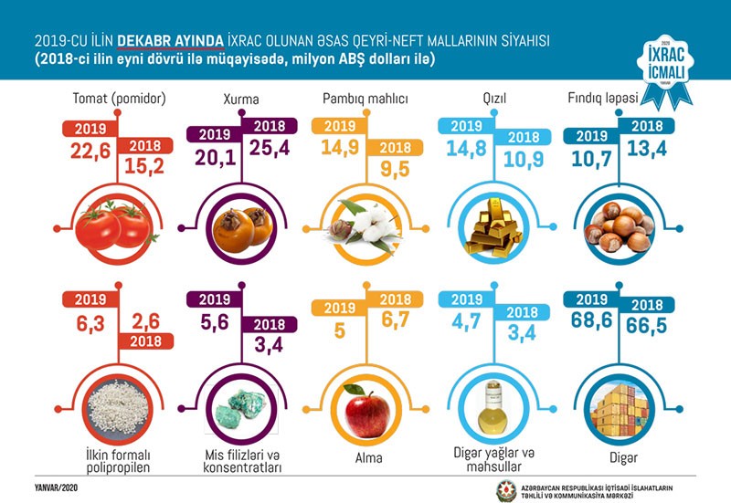 2019-cu ilin dekabr ayında qeyri-neft sektoru üzrə ixracda pomidor (22,6 milyon ABŞ dolları) birinci, xurma (20,1 milyon ABŞ dolları) ikinci, pambıq mahlıcı (14,9 milyon ABŞ dolları) üçüncü yerdə qərarlaşıb.