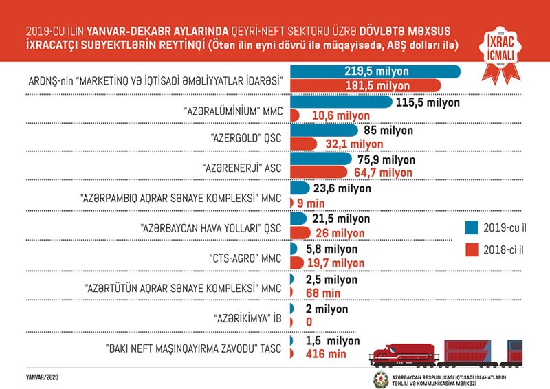 2019-cu ilin dekabr ayında isə qeyri-neft sektoru üzrə ixrac 173 milyon ABŞ dolları təşkil edib. 2018-ci ilin dekabr ayı ilə müqayisədə 2019-cu ilin dekabr ayında qeyri-neft sektoru üzrə ixrac 16 milyon ABŞ dolları və ya 10 faiz artıb. 2019-cu ilin dekabr ayında qeyri-neft-qaz məhsulları ən çox mal Rusiyaya (68,3 milyon ABŞ dolları), Türkiyəyə (38,4 milyon ABŞ dolları), İsveçrəyə (15,1 milyon ABŞ dolları), Gürcüstana (8,5 milyon ABŞ dolları) və Özbəkistana (6,7 milyon ABŞ dolları) ixrac edilib.