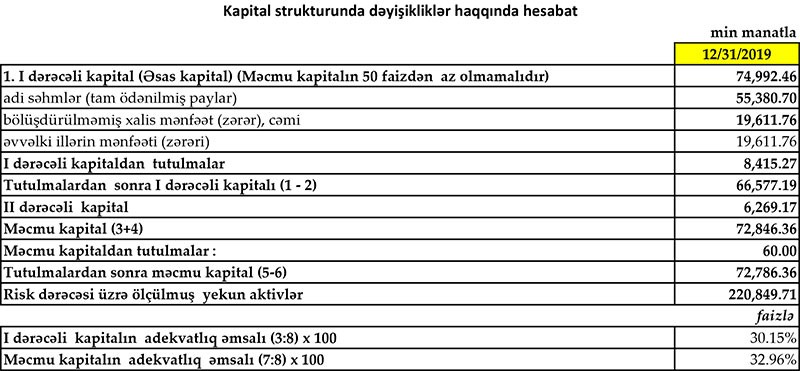 31 Dekabr 2019-cu il tarixində “Yapı Kredi Bank Azərbaycan” 72 milyon 786 min manat məcmu kapitala malik olub.