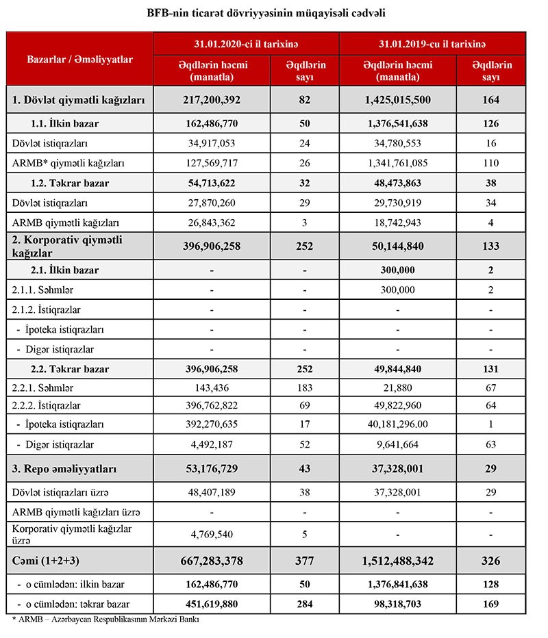 2020-ci ilin yanvar ayı ərzində Bakı Fond Birjasında (BFB) qiymətli kağızlar üzrə keçirilən əməliyyatların ümumi həcmi 667 milyon 283 min manat təşkil edib.