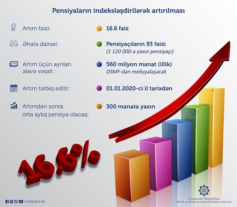 Əmək və Əhalinin Sosial Müdafiəsi Nazirliyindən "Marja"ya daxil olmuş məlumata görə, Sərəncamın icrası olaraq, 2020-ci ilin 1 yanvar tarixinə 2019-cu il üzrə Dövlət Statistika Komitəsi tərəfindən müəyyən edilən orta aylıq nominal əməkhaqqının illik artım tempinə uyğun olaraq bütün növ əmək pensiyalarının sığorta hissəsi indeksləşdirilərək 16,6 faiz artırılır.