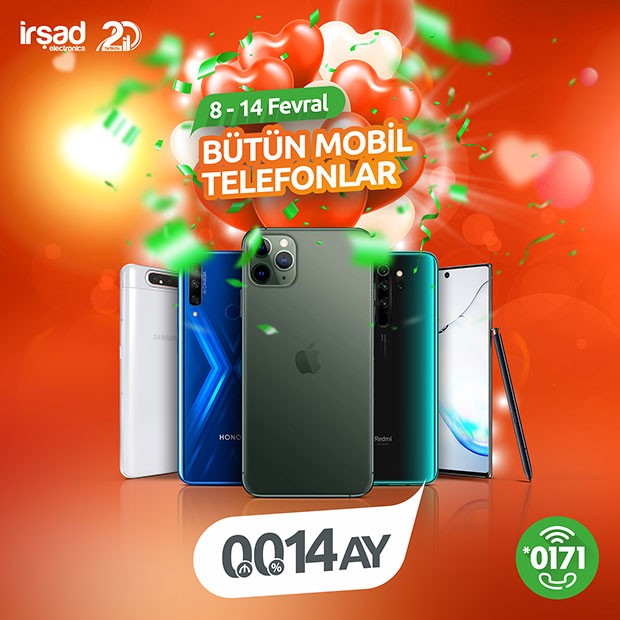 (®) İrşad Electronics Sevgililər Gününə özəl olaraq aksiyaya başlayır. 8 - 14 fevral tarixlərində şirkətin mağazalarından bütün telefonları ilkin ödənişsiz və faizsiz olmaqla 14 ay, bütün məişət texnikasını isə 18 ay hissə-hissə ödəmə şərti ilə əldə etmək mümkündür.