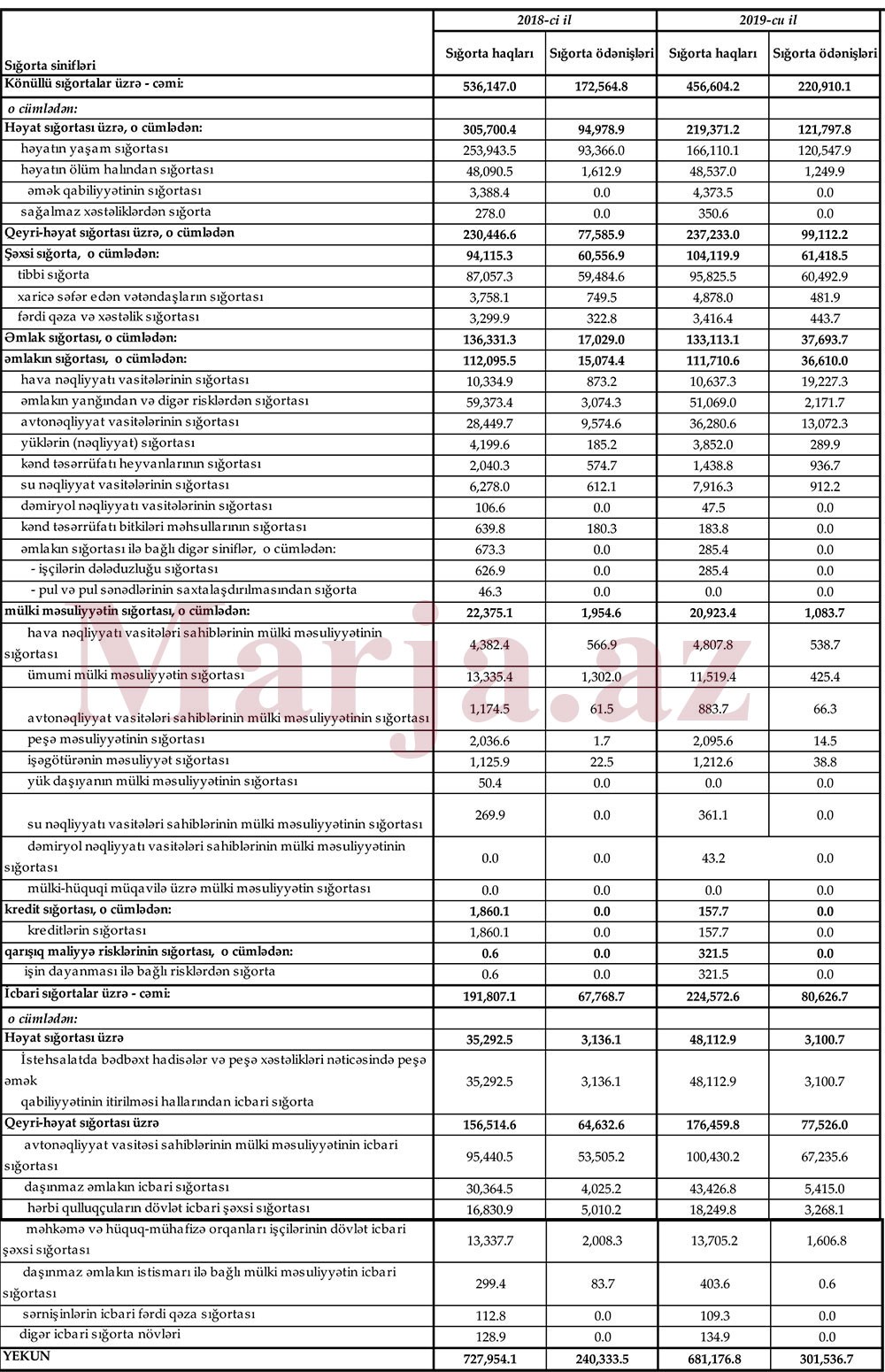 2018-ci və 2019-cu illərdə sığorta növləri üzrə sığorta haqları və sığorta ödənişləri. Marja Mərkəzi Banka istinadən təqdim edir.