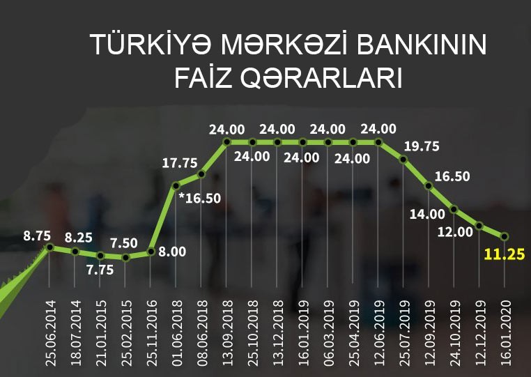 Bu həftə Türkiyə Mərkəzi Bankının faiz qərarı məzənnə baxımından əhəmiyyətli olacaq. Bazarlar Bankın faizi 0,25 bənd endirərək 11,25%-dən 11%-ə salacağını gözləyir. Faizdə 0,50 bənd endirim ediləcəyi proqnozu da verilib.