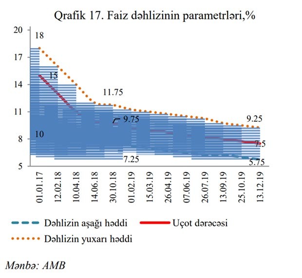 Mərkəzi Bankın İdarə Heyəti 2019-cu ildə faiz dəhlizinin parametrlərini 8 dəfə müzakirə etmişdir. Uçot dərəcəsinin mərhələlərlə 9.75%-dən 7.5%-ə, faiz dəhlizinin yuxarı həddinin 11.75%-dən 9.25%-ə, aşağı həddinin isə 7.75%-dən 5.75%-ə endirilməsi barədə qərarlar qəbul edilmişdir.