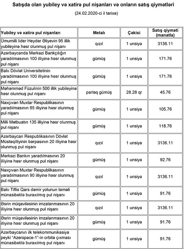 "Azərbaycan Respublikasının Mərkəzi Bankı tərəfindən ölkəmizin görkəmli şəxsiyyətlərinə, tarixinə, mədəniyyətinə, incəsənətinə həsr olunmuş, eləcə də ictimai-siyasi və tarixi proseslərini əks etdirən mövzulara aid, müxtəlif qiymətli metallardan hazırlanmış yubiley və xatirə pul nişanları istehsal olunaraq tədavülə buraxılır. Tədavülə buraxılan yubiley və xatirə pul nişanları ölkə ictimaiyyəti, yerli və beynəlxalq numizmatlar tərəfindən maraqla qarşılanır",- Mərkəzi Bankın məlumatında deyilir.