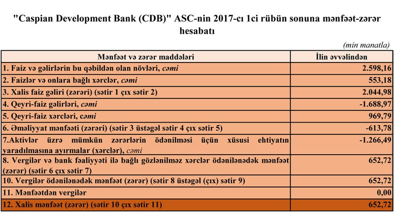 "Caspian Development Bank (CDB)" ASC 2017-ci ilin 1-ci ilin rübünü 652,7 min manat xalis mənfəət ilə başa vurub.