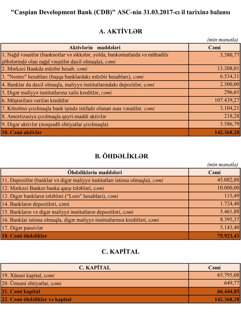 31 Mart 2017-ci il tarixinə "Caspian Development Bank” ASC 142 milyon 368 min manat cəmi aktivlərə, 75 milyon 923 min manat cəmi öhdəliklərə, 66 milyon 444 min manat cəmi kapitala malik olub. Bank ötən 31 Mart 2016-cı il tarixində 120 milyon manat cəmi aktivlərə, 55 milyon 464 min manat cəmi öhdəliklərə, 64 milyon 536 min manat cəmi kapitala malik idi.