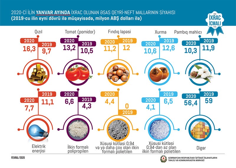 2020-ci ilin yanvar ayı ərzində ixrac edilən qeyri-neft sektoruna aid malların siyahısına qızıl (sikkə kəsilməsində istifadə olunmayan, digər emal olunmamış formalarda – 16,3 milyon ABŞ dolları) başçılıq edib. Bu siyahıda pomidor (13,2 milyon ABŞ dolları) ikinci və qabığı təmizlənmiş meşə fındığı (11,2 milyon ABŞ dolları) üçüncü olub.