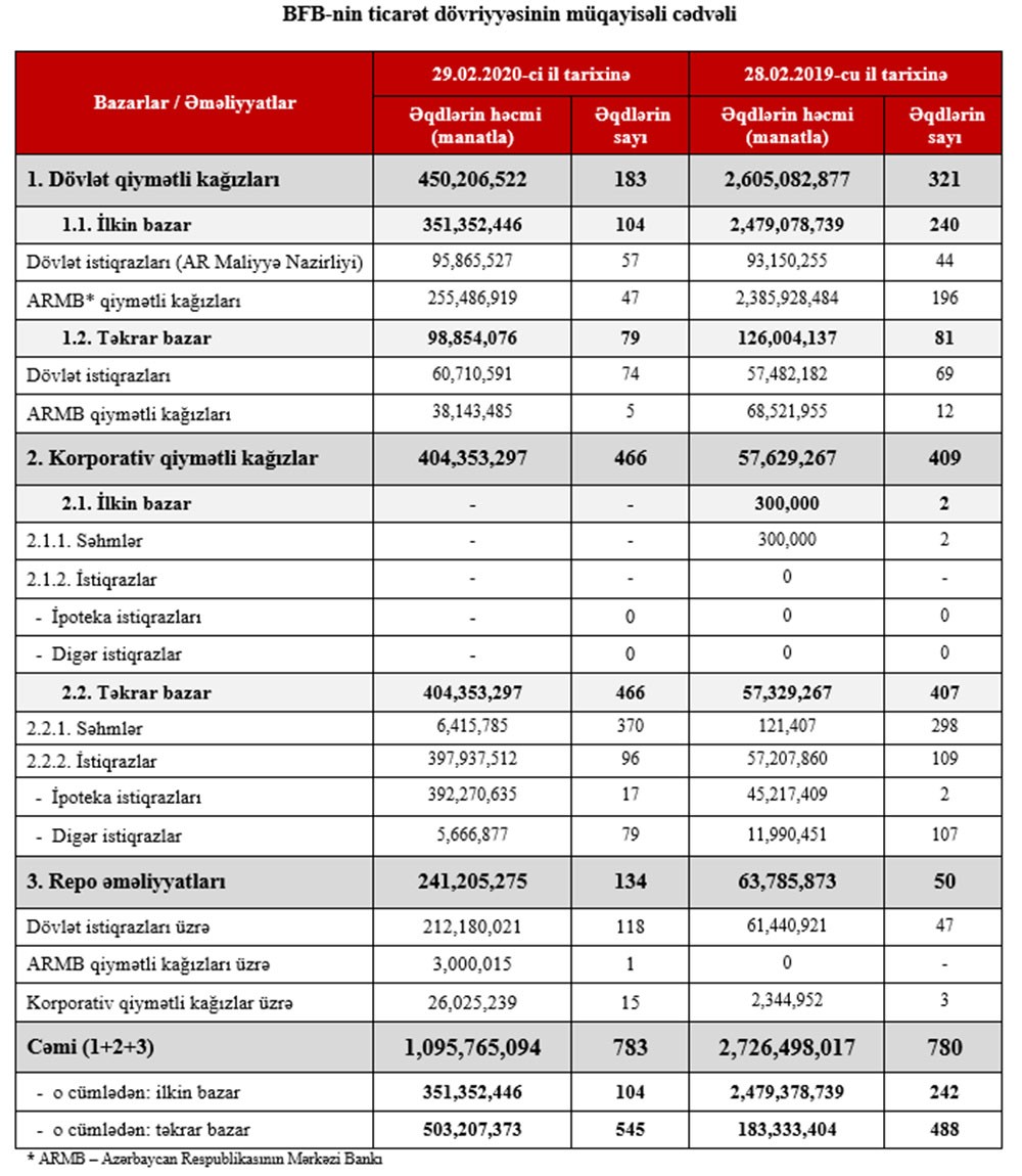“Nəticə olaraq, 2020-ci ilin yanvar-fevral ayları üzrə dövlət qiymətli kağızların (Mərkəzi Bank və Maliyyə Nazirliyi) ilkin bazarında yerləşdirmələrin həcmində ötən ilə nəzərən azalma müşahidə olumasına baxmayaraq, ümumi təkrar bazar üzrə ticarət həcmində 174%, repo əməliyyatları üzrə isə 278% böyümə qeydə alınmışdır”,- Birjanın məlumatında deyilir.