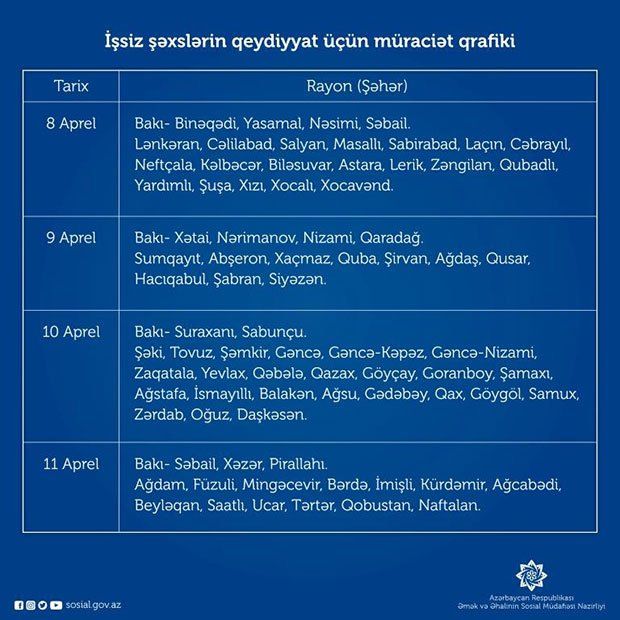 Rayon və şəhərlər üzrə işsiz şəxslərin qeydiyyata alınmaları üçün elektron qaydada müraciət günləriƏmək və Əhalinin Sosial Müdafiəsi Nazirliyi birdəfəlik ödəməni almaq hüququna baxılması üçün işsiz şəxslərin qeydiyyatı ilə bağlı müraciətlərin çoxluğunu nəzərə alaraq ölkənin şəhər və rayonları üzrə elektron qaydada müraciət günlərinin qrafikini təqdim edir.