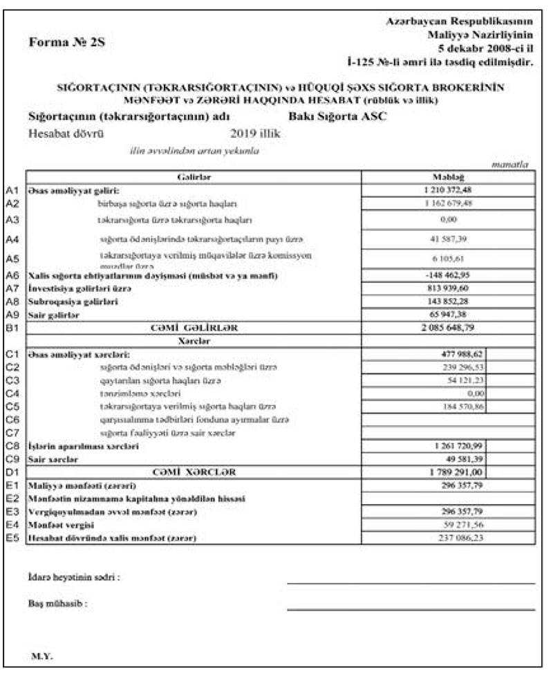 Müqayisə üçün qeyd edək ki, 2018-ci ildə “Bakı Sığorta”nın cəmi gəlirləri 2 milyon 109 min manat, cəmi xərcləri 1 milyon 691 min manat, əməliyyat mənfəəti (maliyyə mənfəəti) 418 min manat təşkil etmişdi. Şirkət həmin il maliyyə mənfəətindən 83 min 605 manat mənfəət vergisi ödəmişdi.
