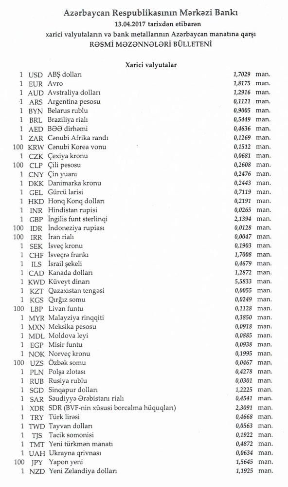 Aprelin 13-nə Mərkəzi Bankın açıqladığı rəsmi Dollar/manat məzənnəsi Aprelin 12-i ilə müqayisədə dəyişməyərək 1,7029 manat olub, Avro/manat məzənnəsi isə 1.8175 manata qalxıb.