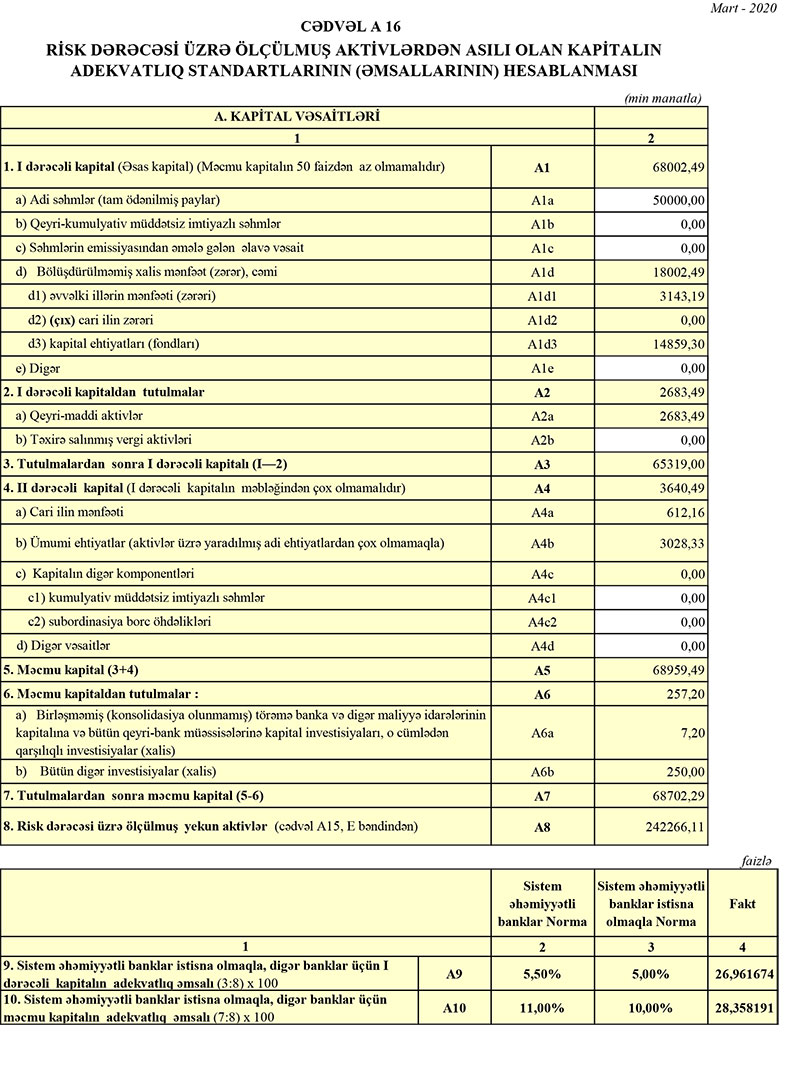31 Mart 2020-ci il tarixində “Ziraat Bank Azərbaycan” 68 milyon 702 min manat məcmu kapitala malik olub.