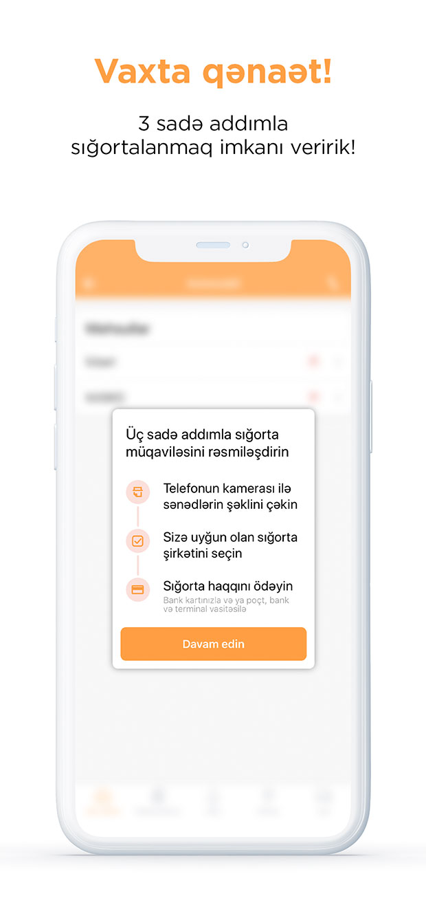 3) 3 sadə addımla sığortalanmaq imkanı verən tətbiqetmə müştərinin qızıldan dəyərli vaxtına qənaət edir. Müqavilənin rəsmiləşdirilməsi cəmi 3 dəqiqə ərzində başa çatır.