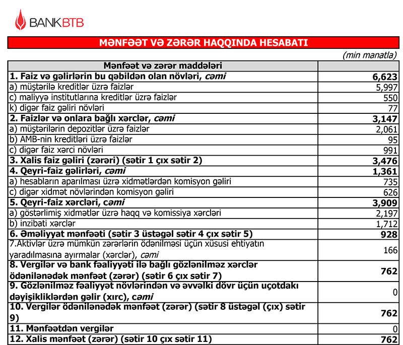 Müqayisə üçün qeyd edək ki, 2019-cu ilin yanvar-mart dövründə “Bank BTB”nin cəmi gəlirləri 6 milyon 641 min manat, cəmi xərcləri 6 milyon 362 min manat təşkil etmişdi. Gəlirlər xərcləri üstələdiyindən Bankın 279 min manat əməliyyat mənfəəti yaranmışdı. “Bank BTB” ehtimal olunan depozit və kredit itkiləri üçün ehtiyatın yaradılmasına 2 milyon 966 min manat ayırdığından rübü 2 milyon 688 min manat zərər ilə bağlamışdı.