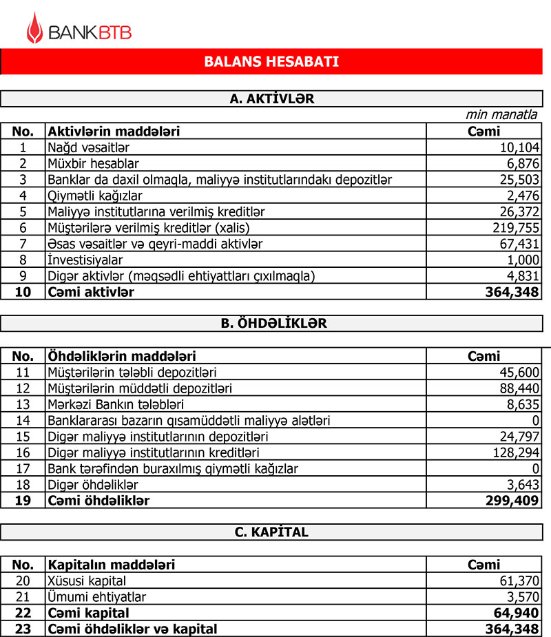 Bankın yaydığı məlumata görə, 2020-ci ilin birinci rübündə Bank BTB-nin cəmi aktivləri 364 milyon 348 min manat təşkil edib ki, bu da ötən ilin müvafiq dövrü ilə müqayisədə 25 % artım deməkdir.